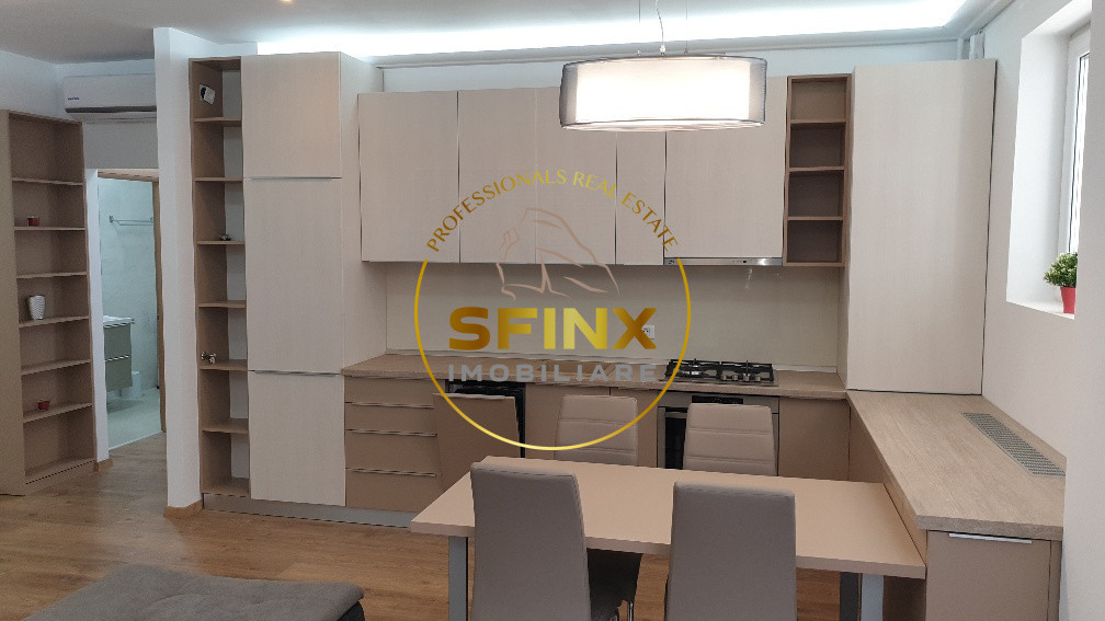 Acesta este complet mobilat, iar mobilierul este executat pe comanda. Incalzirea e cu centrala termica Vaillant cu termostat programabil si răcirea cu dublu split Hyundai. Masina de spalat rufe este Indesit, cu uscator. Bucataria este utilata cu frigider incorporat, masina spalat vase, hota, plita pe gaz si cuptor electric Whirlpool.