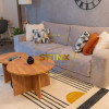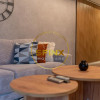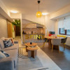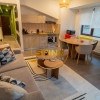 Living + bucătărie open space: frigider, aragaz, cuptor electric, hotă, mobilier de bucătărie, masă de dining, canapea extensibilă, măsuță de cafea, birou și scaun de birou, aer condiționat