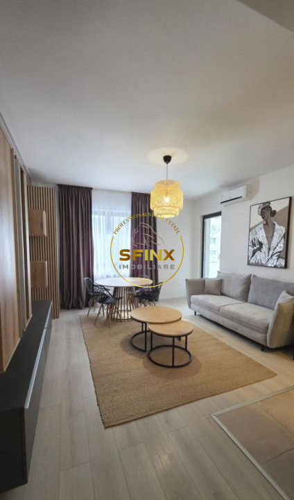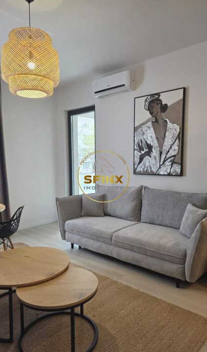 Livingul este generos si luminos, cu zona de relaxare, bucatarie deschisa si zona dining integrata armonios. Dormitorul este intim, cu spatii de depozitare bine gandite, iar baia beneficiaza de finisaje moderne. Bucataria este complet echipata, pregatita pentru utilizare imediata.