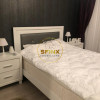 Dormitor elegant, cu pat matrimonial, două noptiere, comodă cu sertare și oglindă, plus dressing spațios.