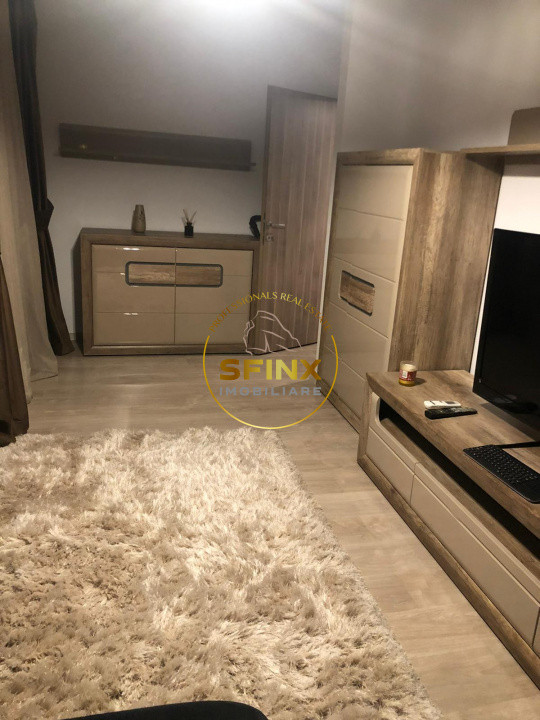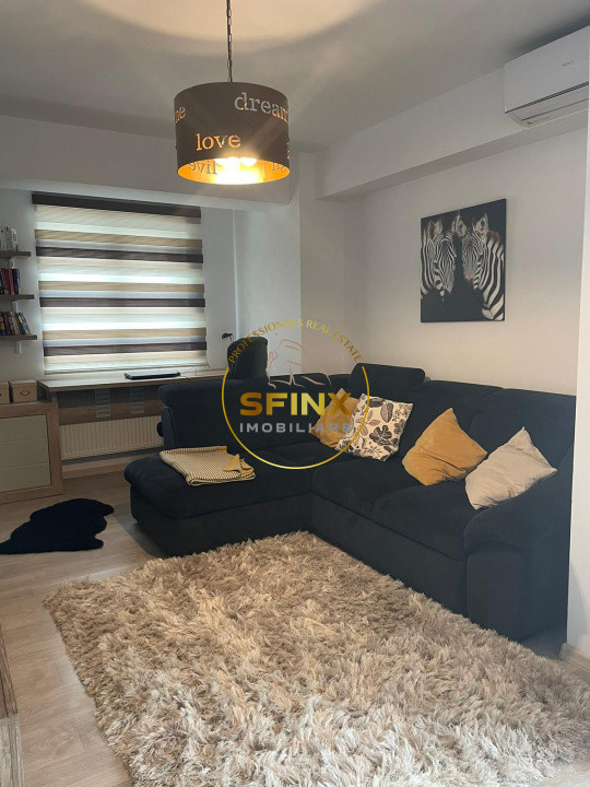 Living luminos și spațios, dotat cu TV, canapea extensibilă și birou de lucru cu scaun din piele – ideal pentru work from home.