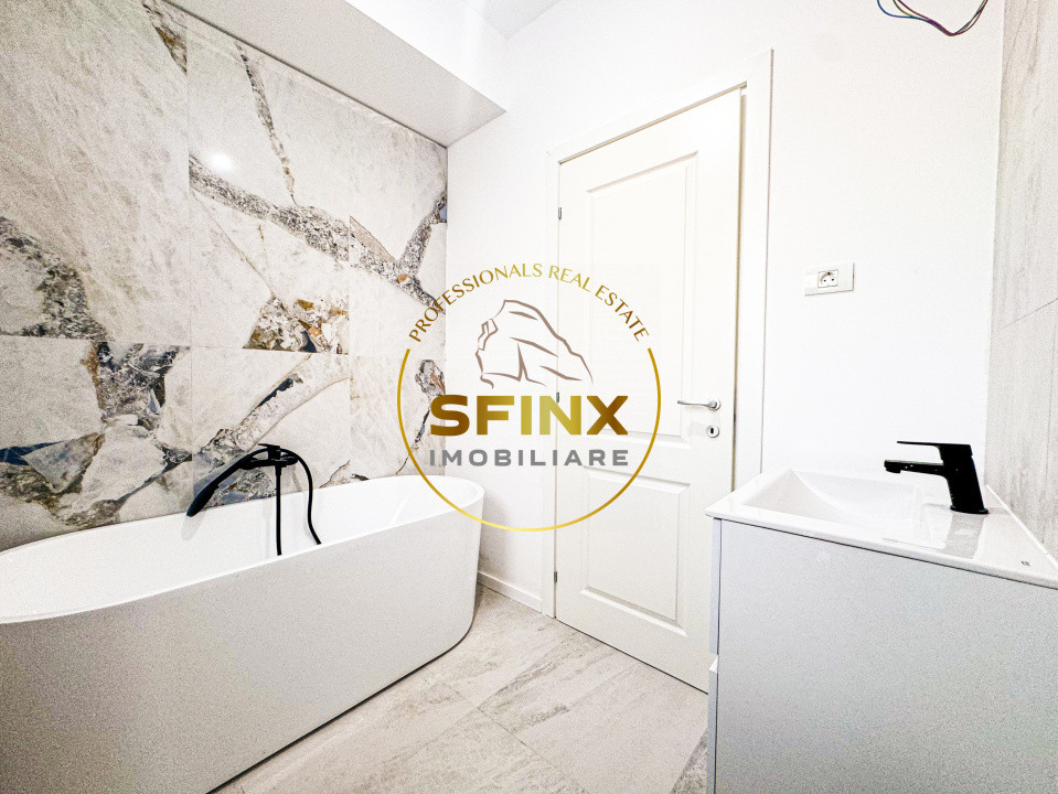 • Băi moderne cu cadă freestanding, duș walk-in și obiecte sanitare Roca