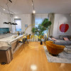 Holul ne conduce catre livingul spatios si luminos cu vedere panoramica catre Manastirea Casin si catre parcul interior al complexului. Bucataria este echipata complet, inclusiv cu farfurii, pahare, vase pentru gatit etc