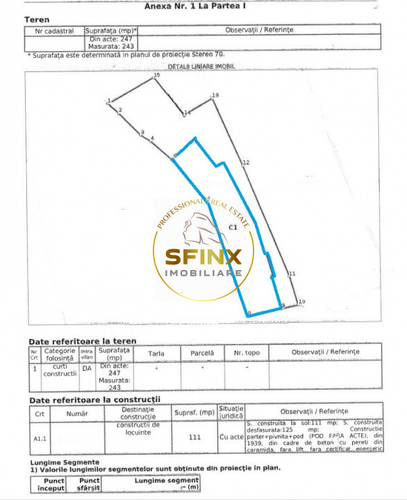 Suprafata terenului pe care este amplasata casa este de 243 mp, iar cladirea in sine are o suprafata utila de 87 mp, o amprenta la sol de 111mp si o suprafata construita destafusraa de 125mp (asa cum rezulta din schitele cadastrale publicate).