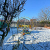 Curtea este atent amenajată, cu alei pavate din dale ceramice colorate, încadrate de gard viu, iar accesul se face prin poartă automatizată. În spatele garajului, proprietatea continuă cu o mică livadă de meri, un colț natural perfect pentru zilele însorite de vară.