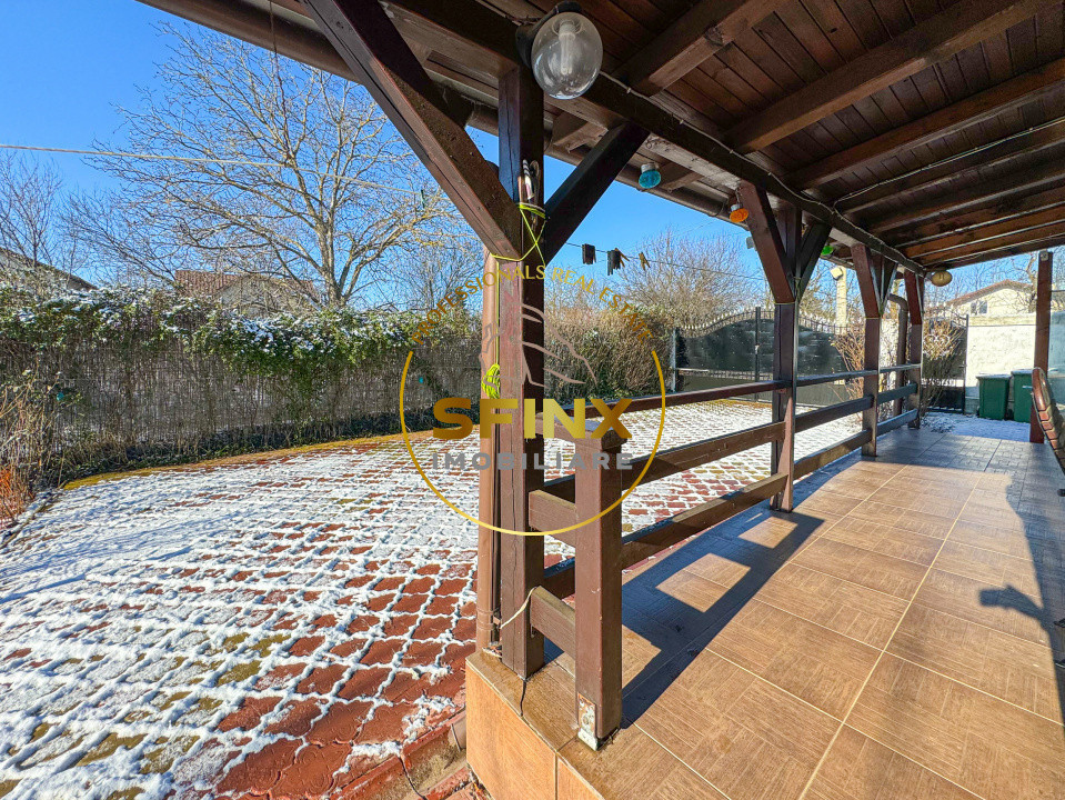 Vila, foarte îngrijită și cochetă, are o amprentă la sol de 87 mp și este completată de o terasă exterioară din lemn de aproximativ 18,5 mp – spațiul perfect pentru dimineți liniștite cu o cafea sau seri relaxante alături de familie și prieteni.