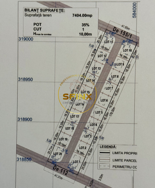 Terenul este lotizat in 10 loturi, are o suprafata totala de 3702 mp, cu o lungime de 171,5 m si o latime de 20 m, ceea ce il face potrivit atat pentru constructie rezidentiala, cat si pentru investitii pe termen lung.
